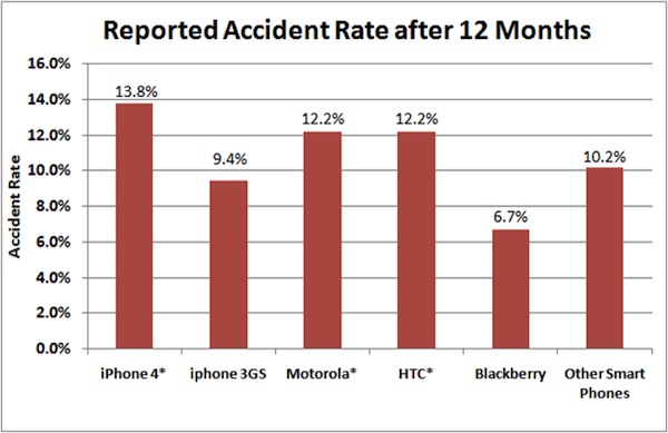 Η SquareTrade συνέκρινε τα ποσοστά των πρώτων μηνών κυκλοφορίας των δύο συσκευών και τα αποτελέσματα δείχνουν ότι οι χρήστες iPhone 4 έχουν κατά 68% περισσότερα ατυχήματα με τη συσκευή τους σε σχέση με τους χρήστες iPhone 3GS. Μάλιστα, ένα ποσοστό 4.7% των χρηστών iPhone 4 ανέφεραν ατύχημα στην SquareTrade τους πρώτους τέσσερις μήνες ιδιοκτησίας ενώ το αντίστοιχο ποσοστό για το iPhone 3GS πέρσυ ήταν στο 2.8%.