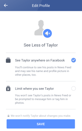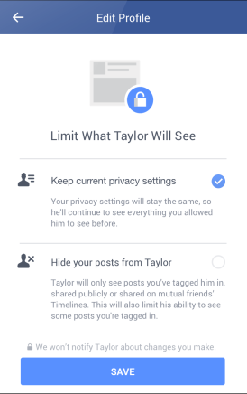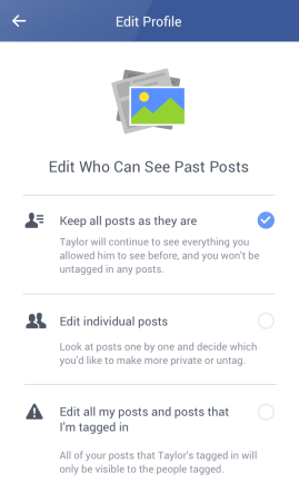 Επίσης, ο χρήστης μπορεί να κρύψει και τη δική του δραστηριότητα από το συγκεκριμένο άτομο, να αφαιρέσει tags από κοινές φωτογραφίες και posts, αλλά και να επιλέξει ποιοι χρήστες θα έχουν τη δυνατότητα να δουν παλαιότερα posts που συμπεριλαμβάνουν τον/την πρώην.