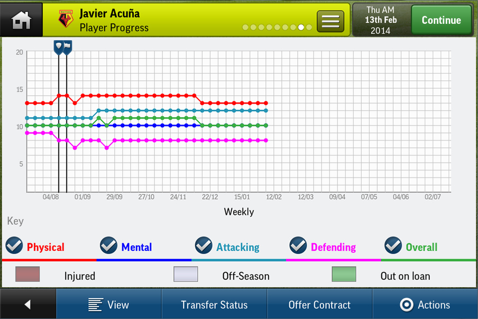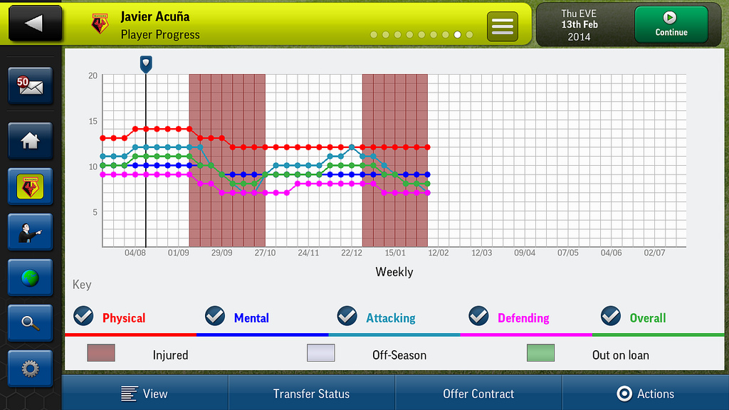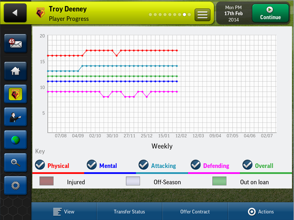 - Use the new player progression tracking system to monitor the progress of your players’ attributes over time. These pages chart the improvement or decline of your players’ skills and are the perfect visual aid for making those tough decisions on whether players have a future at the club.