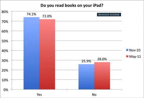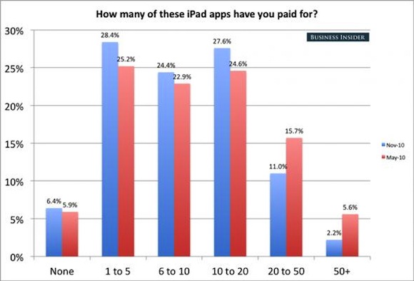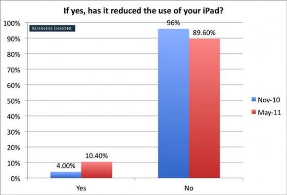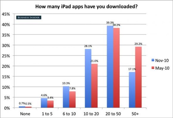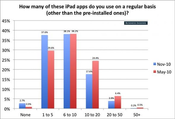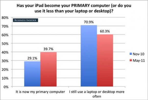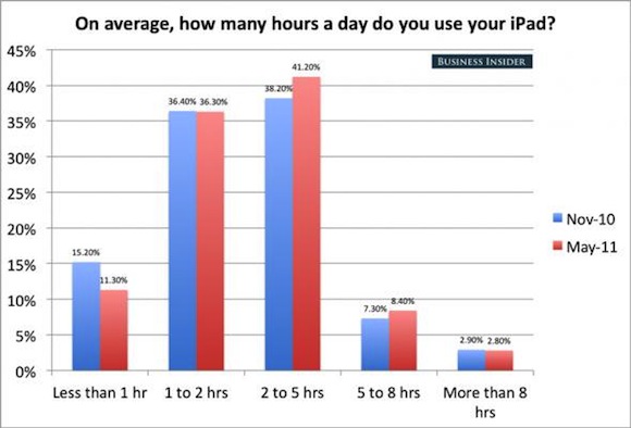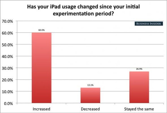 Έρευνα που διεξήχθη ανάμεσα σε 850 αναγνώστες ιστοσελίδας αποκαλύπτει το πώς πραγματικά χρησιμοποιείται το iPad ένα χρόνο μετά την κυκλοφορία του. Μερικά από τα πιο ενδιαφέροντα αποτελέσματα μπορείτε να τα δείτε σε μορφή διαγράμματος παρακάτω: