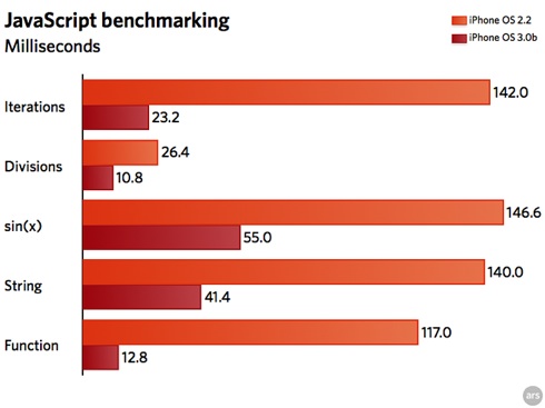 Comparison between iPhone OS 2.2.1 and the iPhone OS 3.0 beta running the WebKit team’s SunSpider benchmark.