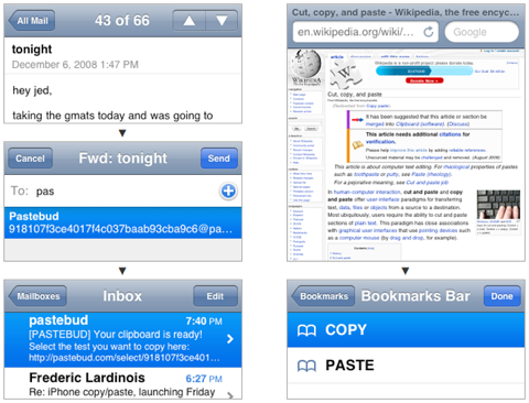 To Pastebud είναι μια νέα υπηρεσία που επιτρέπει το copy & paste κειμένου μεταξύ των εφαρμογών Safari και Mail του iPhone αλλά και μεταξύ ιστοσελίδων. Δεν απαιτείται η εγκατάσταση κάποιας εφαρμογής καθώς δουλέυει με την αποθήκευση δύο σελιδοδεικτών στον Safari.